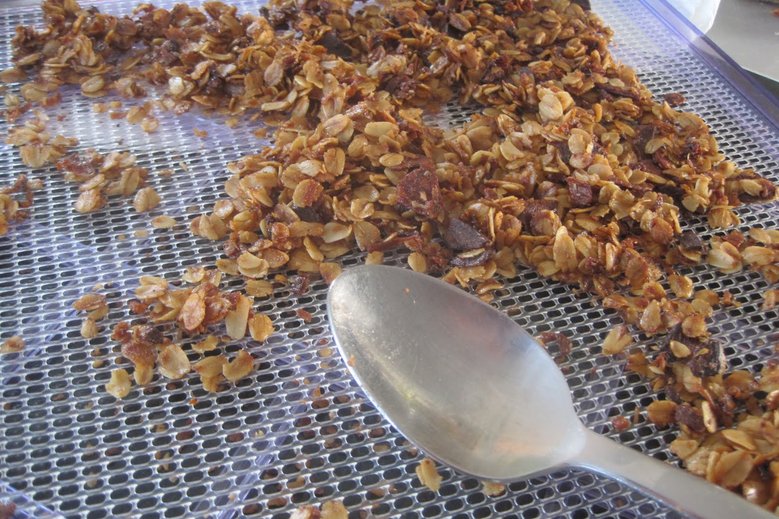 I took the granola out of the oven and put it all back on my dehydrator trays in hopes of drying out the remaining oil and salvaging it. Even plain yogurt can't mask the taste of burnt: