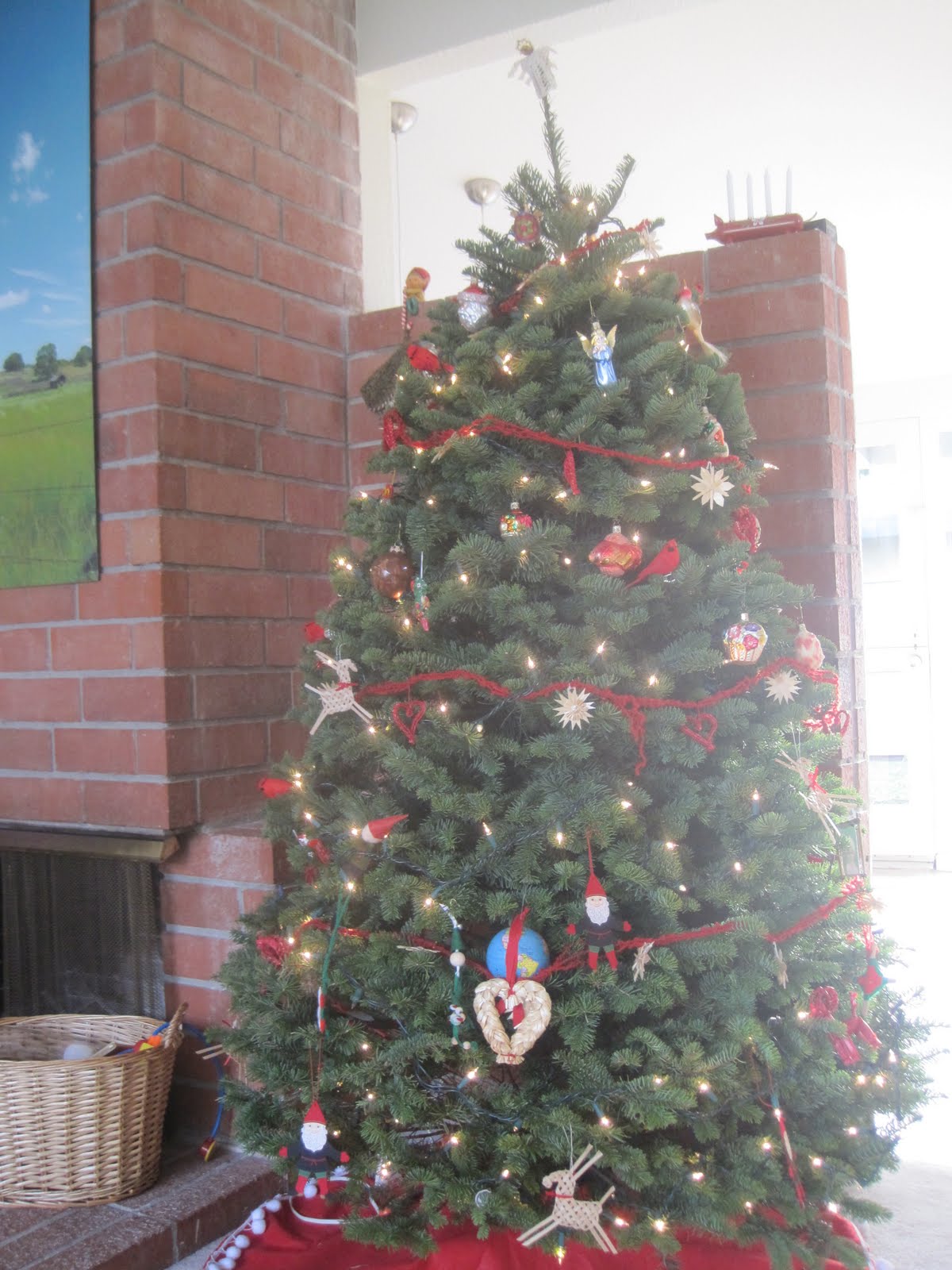 Our tree is up. Yes, we bought it at Osh. Yes, it looks emaciated in regards to ornaments. I love to make my own ornaments with gingerbread dough, but those darn ants put a monkey wrench in that plan. I did manage to braid some yarn, add some Ikea decorations to the strand, and drape it around the tree as my homemade garland. That is good enough and makes me smile:
