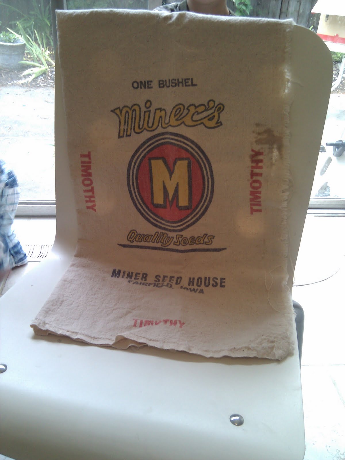 I also bought this vintage seed sack from Iowa for $10. I washed it and am going to open it up and turn it into a quilt. The fabric gets so soft after laundering and I loved reading about how the women used to make their clothing and sheets out of flour and seed sacks. It took three sacks to make one bed sheet back then. Imagine faded, blue and white striped fabric around it for a farm/nautical theme.