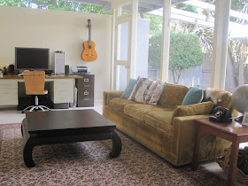 I just picked up this area rug for $20 at an estate sale down the street. It has that bohemian look I was going for with a bohemian price tag. The estate sale was in an Eichler with lots of mid-century things that I wanted to call my own. I have no room for them, but would love to go back and buy the: long, double grained coffee table, the funky patio chairs, the oval table with a wooden geometric design that came with a leaf and the chairs, and the list goes on and on. Keep me away!