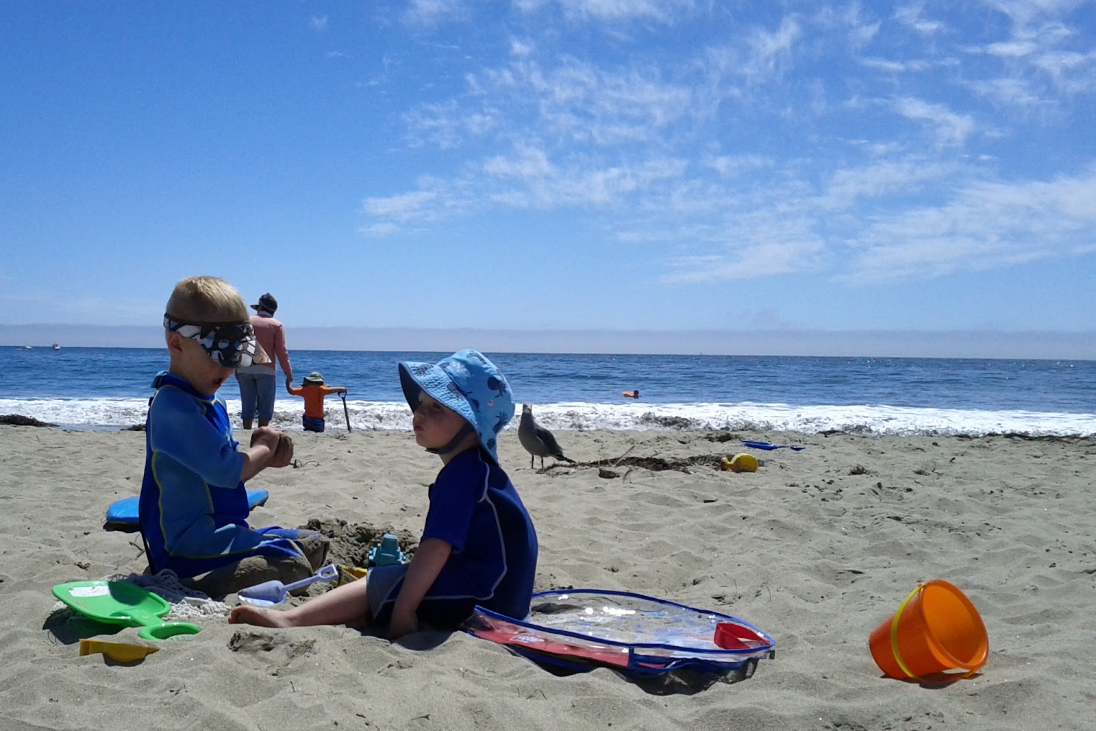 I had to squeeze one more beach trip in before school starts for Blake. The rest of the family went on a beach RV trip after Piper's birth so I felt now was the time to introduce her to the beach. Google Maps is so great because I could satellite view all the beaches to find the one with the most up-front parking. Not only does Twin Lakes State Beach in Santa Cruz have beach front parking, it has two restaurants and a coffee shop. It isn't the most scenic, but it has the amenities.
